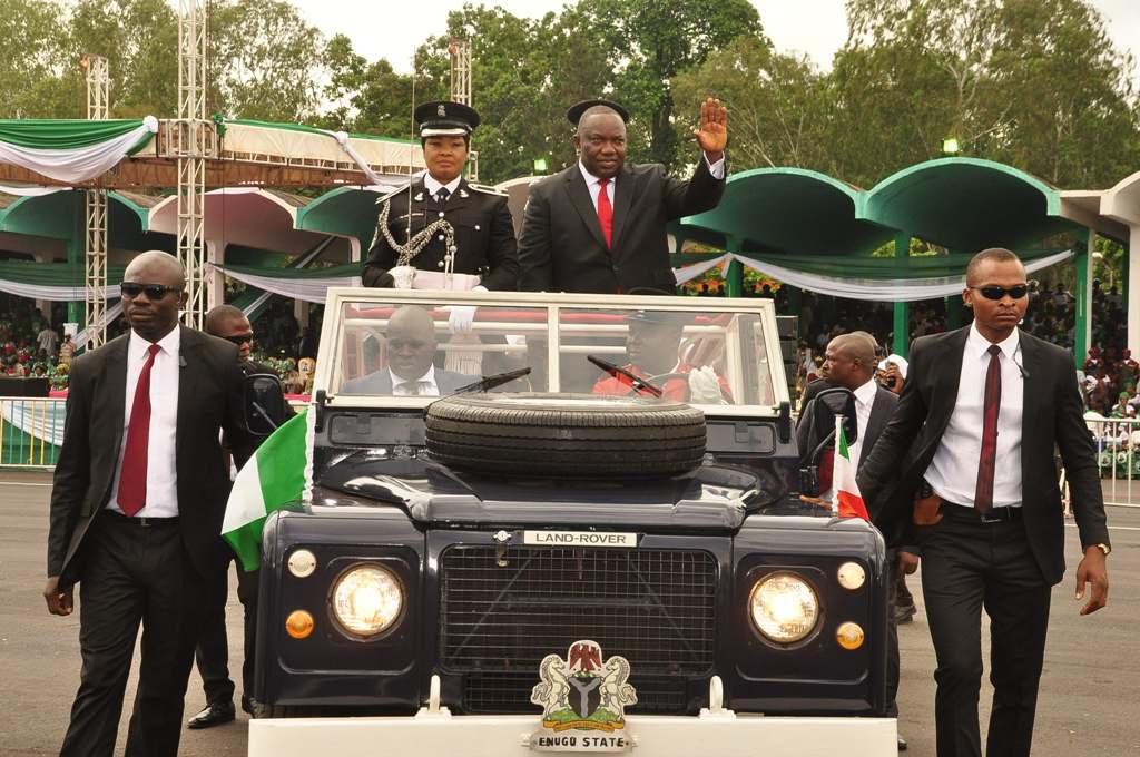 | Governor Ifeanyi Ugwuanyi of Enugu State (waving) acknowledging cheers from the crowd during |the 2017 Democracy Day celebration at the Michael Okpara Square, Enugu. |